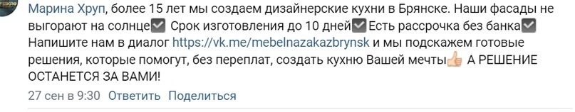 Продвижение во Вконтакте на изготовление кухонь на заказ в Каменногорске